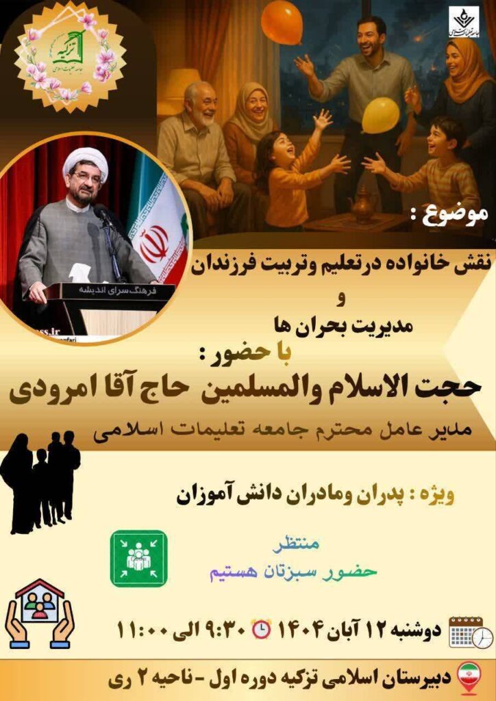 تقی زاده معاون پرورشی دبیرستان دخترانه دور اول تزکیه شهر ری در مصاحبه با روابط عمومی جامعه تعلیمات اسلامی با اعلام این خبر افزودکه،صبح امروز دوازدهم آبان ماه دومین جلسه آموزش خانواده ویژه خانوادههای دانش آموزان دبیرستان دخترانه دور اول تزکیه اسلامی شهر ری با موضوع« نقش والدین در تربیت فرزندان» با حضور حجت الاسلام والمسلمین امرودی مدیرعامل جامعه تعلیم اسلامی برگزار شد. معاون پرورشی دبیرستان دخترانه تزکیه اسلامی شهر ری گفت، قبل از شروع سخنرانی حجتالاسلام والمسلمین امرودی برنامه های متنوعی از طرف دانش آموزان اجرا گردید که می توان به، تلاوت قرآن توسط یکی ازحافظ کل،اجرای سرود ملی،پخش کلیپ شهدایی،قرائت صلوات خاصه حضرت زهرا (س)و پخش نوحه خوانی و دکلمه به مناسبت ایام فاطمیه ( س) اشاره نمود.تقی زاده در باب مطالب مطرح شده در این جلسه آموزشی توسط مدیرعامل جامعه تعلیمات اسلامی افزود که،ایشان بر حضور فعال و همراهی اولیا در برنامههای آموزشی خانواده با هدف تقویت دو کانون مهم تربیت( مدرسه و خانواده) تاکید نمودند و در باره تاثیر ارتباط خانواده ها با مشاورین مورد تایید دبیرستان افزودند که اولیا باید با مدرسه و کادر آن به عنوان رکن اصلی تربیت فرزندانشان در زمینه های مختلف آموزشی و پرورشی همکاری و اعتماد نمایند . زیرا کادر مدارس جامعه تعلیمات اسلامی از نیروهای مومن و متخصصی است که در ارائه و انجام هر نوع خدمت در مدارس،بر این باور هستند که این دانش آموزان فرزندان معنوی آنها و آینده سازان فردای ایران اسلامی می باشند.