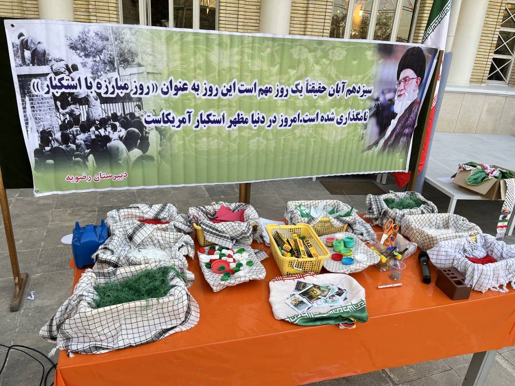 در همین راستا سرکار خانم چیزری مدیر جدید این مجتمع آموزشی گزارشی از فعالیت های این مجتمع را به مناسبت یوم الله ۱۳ آبان برای روابط عمومی جامعه تعلیمات اسلامی ارسال نمودند که از جمله می توان به شرکت بانشاط و پرشور دانش آموزان این مجتمع در راهپیمایی روز سیزده آبان و اجرای برنامههای مختلف در محل غرفه جامعه تعلیمات اسلامی، شرکت در نمایشگاه فنآوری نانو، اجرای برنامه های شاد و متنوع در مدرسه به مناسبت روز دانش آموز، برگزاری مراسم با شکوه و معنوی حدیث کساء و دکلمه خوانی و تنظیم و قرائت دکلمه ضد استکبار ستیزی به همراه اجرای سرود صبح امید توسط دانش آموزان ، اجرای کم نظیر مسابقه طراحی پرچم ایران عزیزبا موضوع « وفاق ملی» و برگزاری جشن بادکنک ها با شعار و دلنوشته ملی به همراه آتش زدن پرچم اسرائیل و آمریکا به عنوان نمادهای ستمگری ،جنگ و جنایت و اهدای هدایا به همراه اهدای لوح مخصوص به دانش آموزان و پذیرایی از دانش آموزان، ازجمله برنامههای یوم الله ۱۳ آبان مجتمع آموزشی رضویه اسلامی بود.