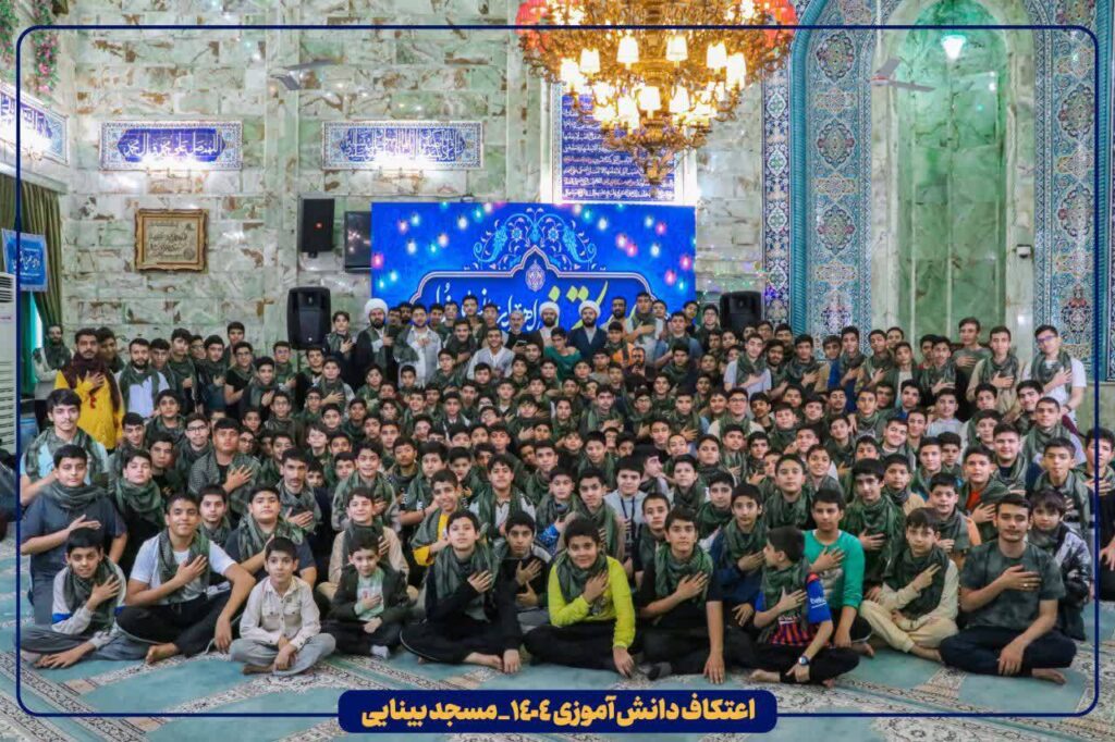 یک قاب پایانی زیبا از حضور ۲۰۰ نفر از دانش آموزان مجتمع جعفری اسلامی تهران در مراسم معنوی اعتکاف سال ۱۴۰۴ در مسجد بینایی.